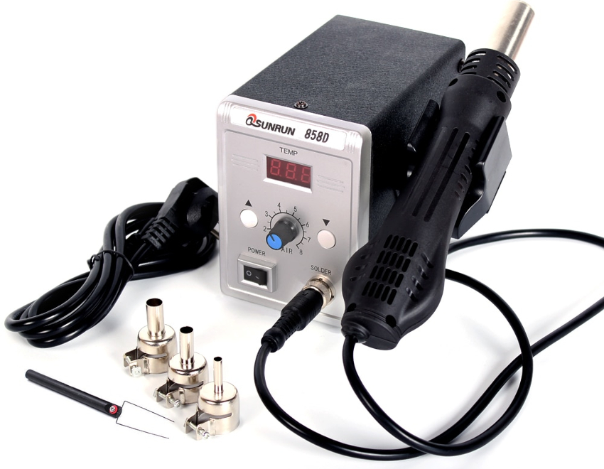 Das Qsunrun 858D-Tool ist hinsichtlich der technischen Eigenschaften mittelmäßig. Hat ein Netzteil mit einer Leistung von 700 W, unterscheidet sich in den günstigsten Kosten - von 942 Rubel. Das Gerät hat alle Standardvorteile, nämlich: