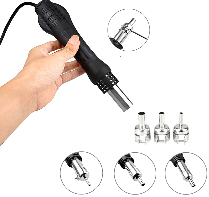 In der Steuereinheit befindet sich eine Membranpumpe, die den Luftstrom zum Haartrockner liefert, und der Haartrockner für die Lötstation selbst ist mit Düsen verschiedener Formen ausgestattet. Sie folgen der Form der gängigsten Mikroschaltungskontakte. Diese Düsen ermöglichen das gleichzeitige Erhitzen mehrerer Elementkontakte. Dank dessen erfolgt die Demontage schnell und ohne Beschädigung des Teils selbst und der Platine.