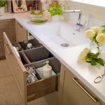 Bei der modernen Küchenrenovierung gibt es verschiedene Möglichkeiten, die Arbeitsfläche zu vergrößern. Wenn nicht genügend Platz zum Schneiden und Verarbeiten von Lebensmitteln vorhanden ist, helfen Arbeitsplatten auf verschiedenen Ebenen oder herausziehbare. Sie können bei Bedarf herausgezogen werden, und wenn sie zusammengebaut sind, stören sie nicht und es ist sehr bequem und kompakt.