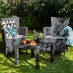 VEDDO. Diese Möbelserie ist für Gärten aller Größen konzipiert. Alle Artikel sind aus strapazierfähigem Kunststoff und Stahl gefertigt. Sie halten verschiedenen mechanischen Einflüssen stand. Die Weddo-Möbellinie umfasst einen Tisch sowie 2 Stühle und einen Hocker. Die Produkte erfordern keine besondere Pflege.
