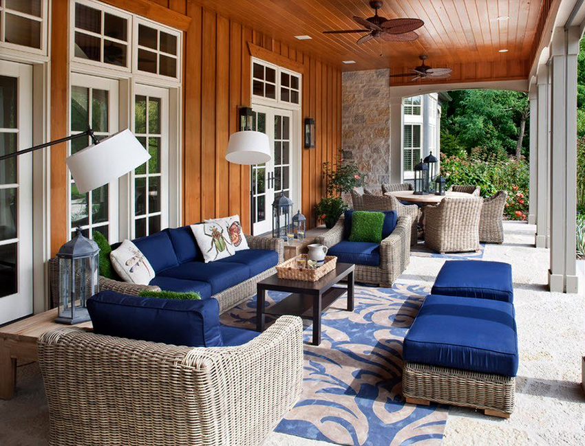 Nautisch. Dieser Stil beinhaltet die Verwendung von Korbstrukturen. Für ihre Herstellung wird Rattan (natürlich und künstlich) verwendet. In diesem Fall eignen sich helle Kissen als Ergänzung zu den Hauptmöbeln. Ein sehr beliebtes Accessoire ist der große Regenschirm, der zum Schutz vor der Sonne dient. Fotos von Gartenmöbeln in diesem Stil zeigen ihre Eleganz und Leichtigkeit.