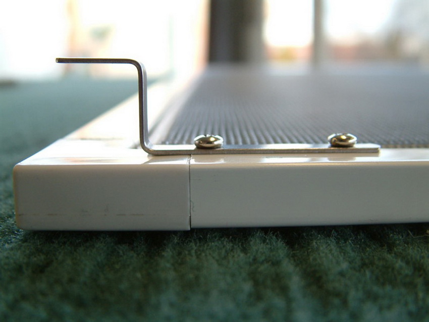 Für die äußere Fixierung des Mückenprodukts werden häufig Plastikecken verwendet, die unauffällig angebracht werden und das Erscheinungsbild des Fensters nicht beeinträchtigen. Elemente werden an den Ecken der Struktur mit selbstschneidenden Schrauben befestigt.