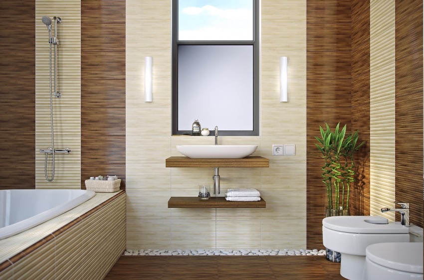 Bambustapeten können mit jedem Veredelungsmaterial kombiniert werden, sei es Fliesen, die Naturstein imitieren, oder gewöhnliche Tapeten oder einfach gestrichene Wände