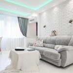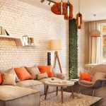 Wenn ein Teilfinish erforderlich ist, wird ein kleiner Bereich der Oberfläche mit Ziegeln bedeckt. Mit dieser Methode können Sie die Festigkeit der Wände des Wohnzimmers betonen.