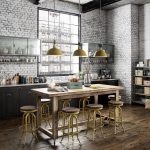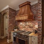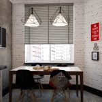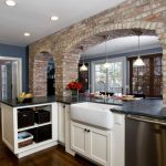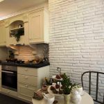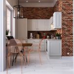 Das Küchendesign ist nahezu unbegrenzt. Der Ziegelstein im Inneren dieses Raums wird ursprünglich das Erscheinungsbild der vorhandenen Ausrüstung betonen. Mit Hilfe von dekorativen Ziegeln können Sie den Raum in Zonen unterteilen und den Bereich hervorheben, in dem der Esstisch stehen wird.