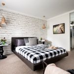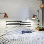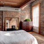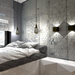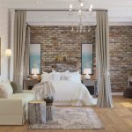 Ziegeldekoration wird im Schlafzimmer angebracht sein. Weißes Mauerwerk betont den modernen Stil des Ruheraums und verleiht dem Raum Charme und Leichtigkeit. Besonders beeindruckend wirkt eine Mauer im Inneren eines zweistöckigen Apartments oder Studios. Dieses Element kann in Form eines Bogens gestaltet werden, der anstelle der Eingangstür zum Aufenthaltsraum installiert wird. Backsteinmauern eignen sich für Schlafzimmer in der Provence, im Loft, im Landhaus, im klassischen und im skandinavischen Raum.