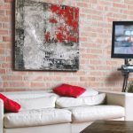 Rotes Mauerwerk fällt sofort ins Auge und zieht die Aufmerksamkeit auf sich. Die Wand selbst kann als dekoratives Hauptelement im Innenraum des Raums verwendet werden, sodass keine zusätzlichen Dekorationen erforderlich sind.