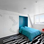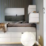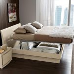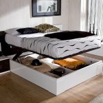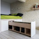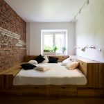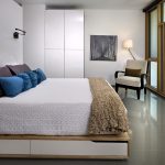 Η τελευταία επιλογή σχεδιασμού συχνά εγκαθίσταται σε μικρά δωμάτια, όπου είναι σημαντικό να χρησιμοποιείτε ορθολογικά κάθε εκατοστό χώρου. Εδώ μπορείτε να εξοπλίσετε ένα ευρύχωρο σύστημα αποθήκευσης στο χώρο του κρεβατιού.