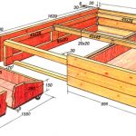 Χρησιμοποιώντας ένα σχέδιο από κρεβάτι από ξύλο με τα χέρια σας, συρτάρια, πλευρικά τοιχώματα, κεφαλάρι και το κάτω μέρος των κουτιών είναι κατασκευασμένα από μοριοσανίδες ή MDF. Το πλαίσιο βάσης είναι κατασκευασμένο από ξύλινα μπλοκ. Το κάτω μέρος για τα κουτιά είναι προσαρτημένο σε αυτό. Συρτάρια και πλευρικά στοιχεία εγκαθίστανται στο πλαίσιο, πάνω από το οποίο το δάπεδο με σχιστόλιθο τοποθετείται κάτω από το στρώμα. Ένα κεφαλάρι κατασκευασμένο από μοριοσανίδες είναι στερεωμένο στη βάση.