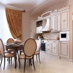 Οι κουρτίνες πρέπει να εναρμονίζονται με το συνολικό εσωτερικό της κουζίνας. Απαιτείται όλες οι επιφάνειες στην κουζίνα να συνδυάζονται σωστά και να αντηχούν μεταξύ τους. Αυτό ισχύει επίσης για το χρώμα των υλικών φινιρίσματος, τον έγχρωμο σχεδιασμό επίπλων κουζίνας, υφασμάτων και ειδών διακόσμησης. Για παράδειγμα, εάν οι τοίχοι της κουζίνας είναι κατασκευασμένοι σε μπεζ ή κρεμ αποχρώσεις, τότε οι κουρτίνες με χρυσή γυαλάδα, κίτρινα μοντέλα ή οποιαδήποτε καφέ απόχρωση θεωρούνται εξαιρετική επιλογή στα παράθυρα.