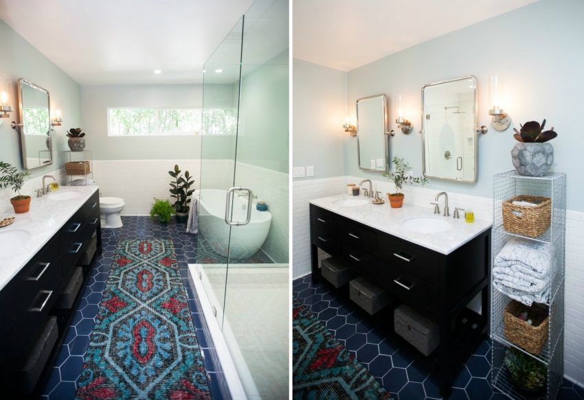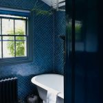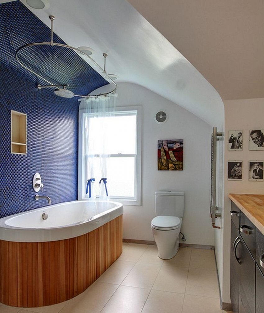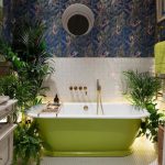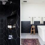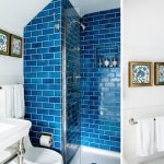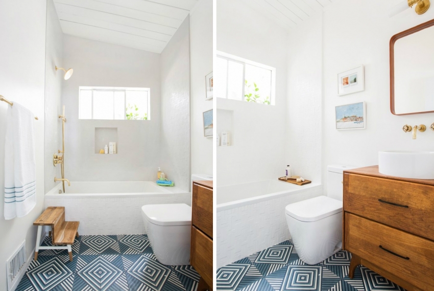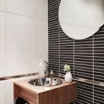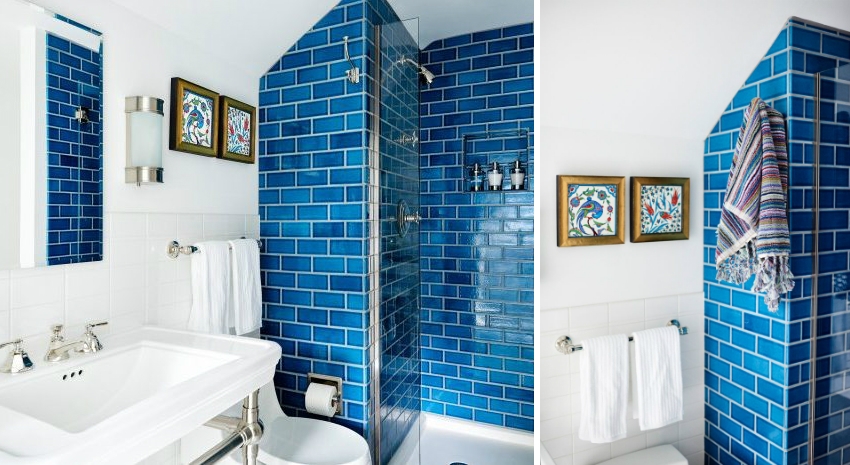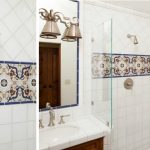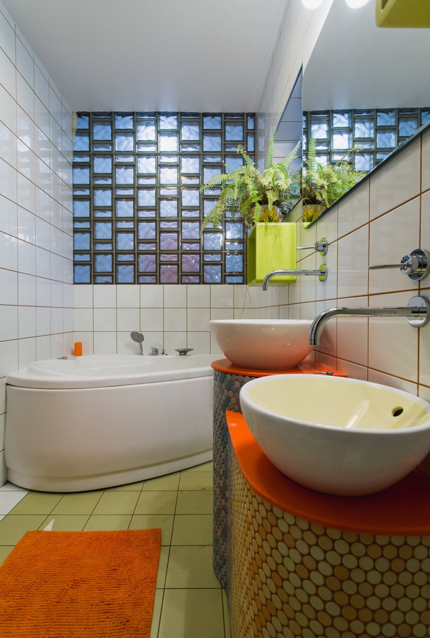 Μπορείτε να προσθέσετε εκφραστικότητα στο μπάνιο με τη βοήθεια φωτεινών διακοσμητικών στοιχείων ή ενθέματα από αντίθετα πλακάκια.