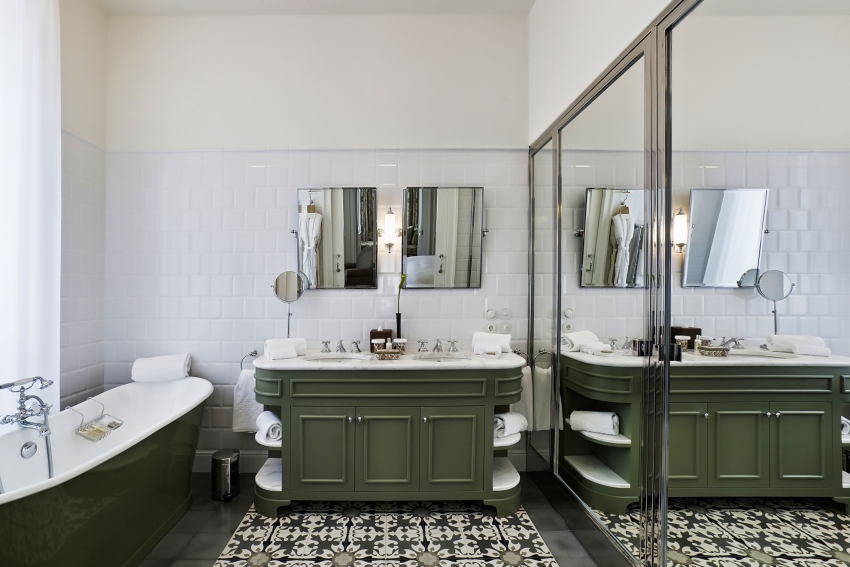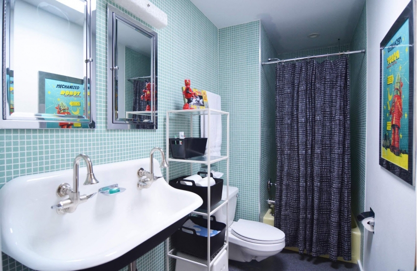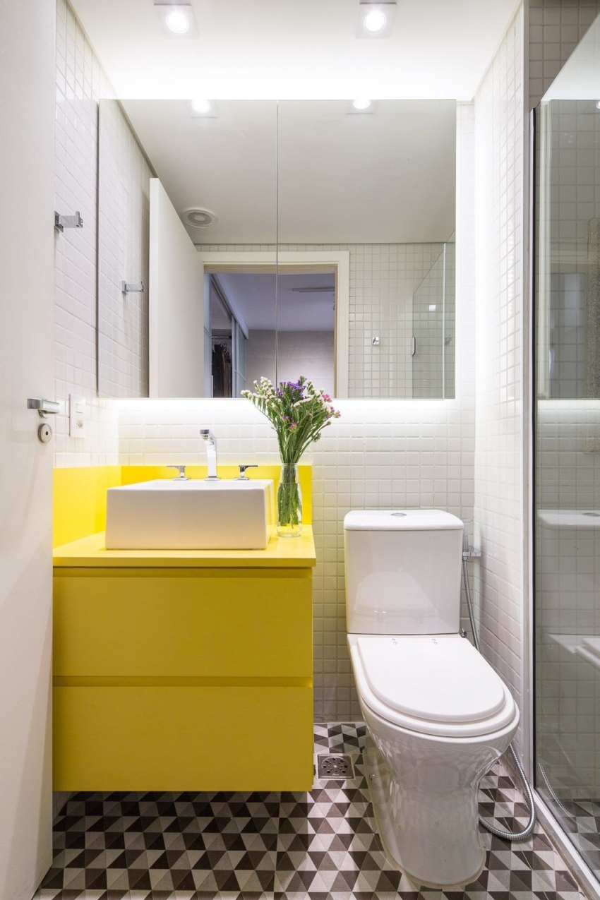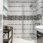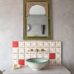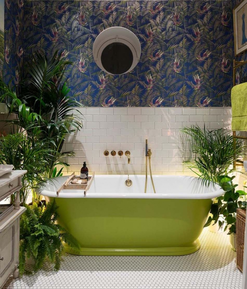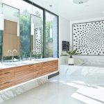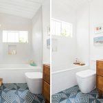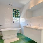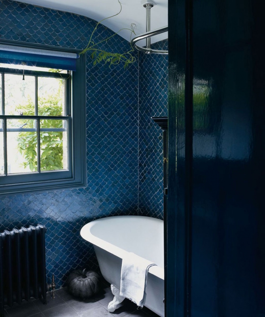 Μπορείτε να προσθέσετε εκφραστικότητα στο μπάνιο με τη βοήθεια φωτεινών διακοσμητικών στοιχείων ή ενθέματα από αντίθετα πλακάκια.