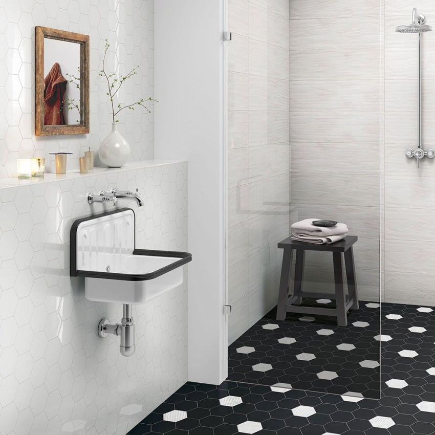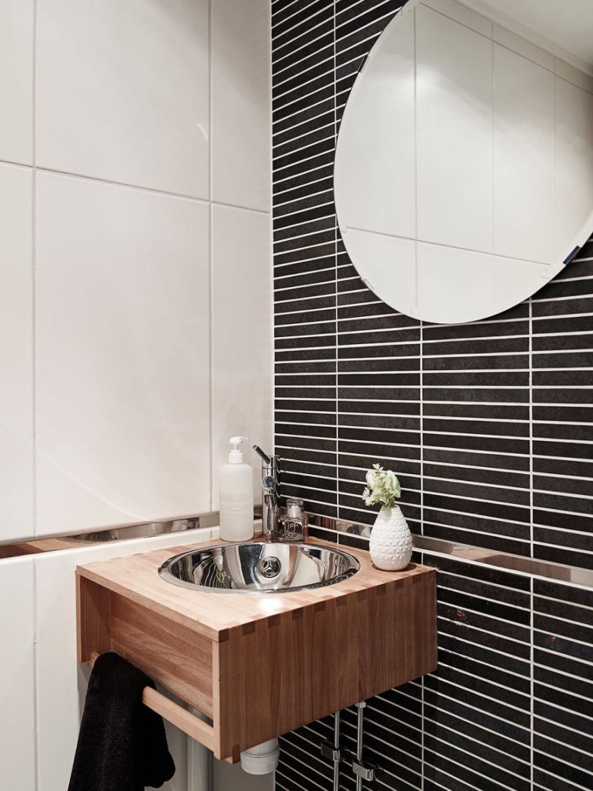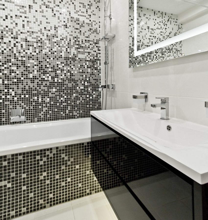 Τα ασπρόμαυρα πλακάκια μπάνιου αντικατοπτρίζουν με επιτυχία τις απαιτήσεις του μινιμαλιστικού στιλ, το οποίο, χάρη στη χρωματική αντίθεση, δημιουργεί έναν άνετο και ταυτόχρονα συγκρατημένο σχεδιασμό του δωματίου.