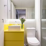 Μοιάζει ασυνήθιστο και πρωτότυπο σχεδιασμός μπάνιου πλακάκια σε μοβ βάση με πιτσιλιές κίτρινου. Οι απλοί τοίχοι μπορούν να συμπληρωθούν από πάνελ διαφορετικών χρωμάτων ή πλακιδίων με σχέδιο στο κάτω μέρος και στην κορυφή.
