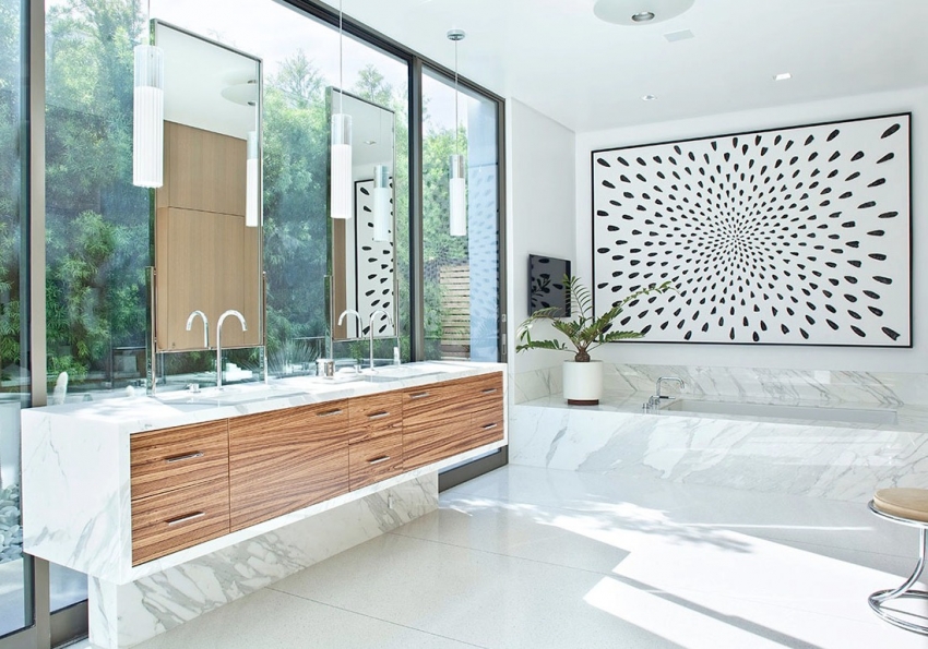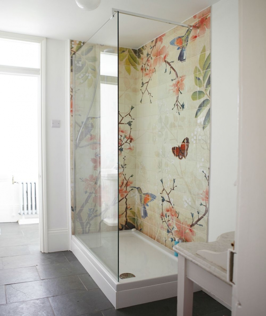 Στο μοντέρνο σχεδιασμό, μια δημοφιλής τεχνική είναι ο συνδυασμός κεραμικών πλακιδίων και απλής τοιχογραφίας με αδιάβροχη βαφή.