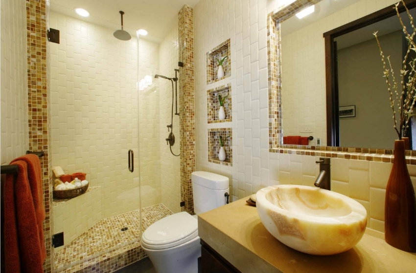 Χρήσιμες συμβουλές!Όταν προτιμάτε τη χρήση πλακιδίων τριών ή περισσότερων χρωμάτων, είναι προτιμότερο να επιλέξετε ένα μωσαϊκό, όπου ακόμη και οι ποικίλες αποχρώσεις ενός μικρού πλακιδίου δεν μπορούν να μειώσουν οπτικά το δωμάτιο.