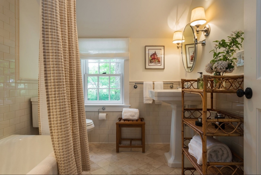 Μπορείτε να δημιουργήσετε ένα άνετο δωμάτιο με απλό σχεδιασμό σε στιλ Προβηγκίας, το οποίο χαρακτηρίζεται από μια ζεστή ήρεμη παλέτα χρωμάτων και φυσικά υλικά. Τα πλακάκια γάλακτος, μπλε, λιλά και μπεζ θα φαίνονται πιο επιτυχημένα στο σχεδιασμό του μπάνιου, το οποίο μπορεί να σκιασθεί με πλακάκια δαπέδου με πιο σκούρα σκιά.