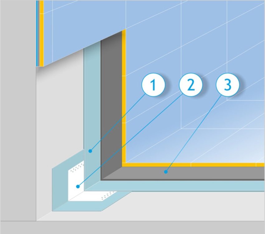 Σχέδιο διάταξης στεγανοποίησης επίστρωσης: 1 - σύνθεση ανθεκτική στην υγρασία του πολυμερούς. 2 - ταινία για ραφές. 3 - κόλλα πλακιδίων
