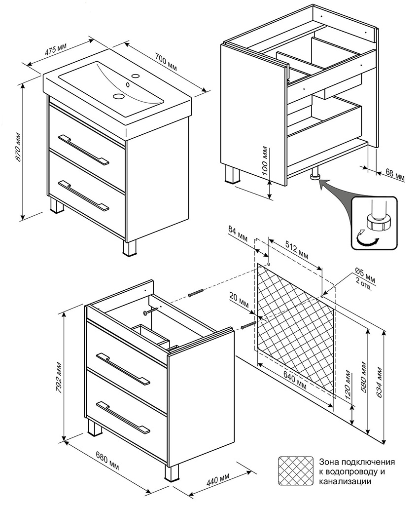 Η μονάδα ματαιοδοξίας στο μπάνιο με τα πόδια εξασφαλίζει απλή εγκατάσταση, ομαλή εγκατάσταση στο προβλεπόμενο μέρος και εύκολη συντήρηση. Ο ελεύθερος χώρος μεταξύ του δαπέδου και του θαλάμου παρέχει κυκλοφορία αέρα και προσβασιμότητα για καθαρισμό. Ο σχεδιασμός μπορεί να αντέξει ακόμη και σε πλημμύρα. Μόνο τα πόδια μπορούν να υποφέρουν.