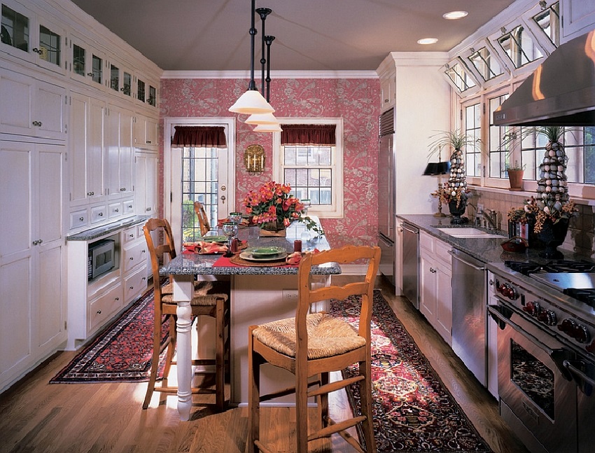 Coverings decorated with ethnic ornaments can fill the kitchen interior with new shades and colors. In the photo of the wallpaper for the kitchen in 2017, made in the national style, you can see coverings decorated with various patterns and patterns.