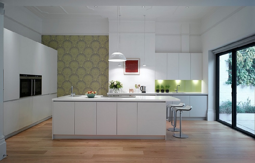 Design and photo of wallpaper for a white kitchen in the interior of the room