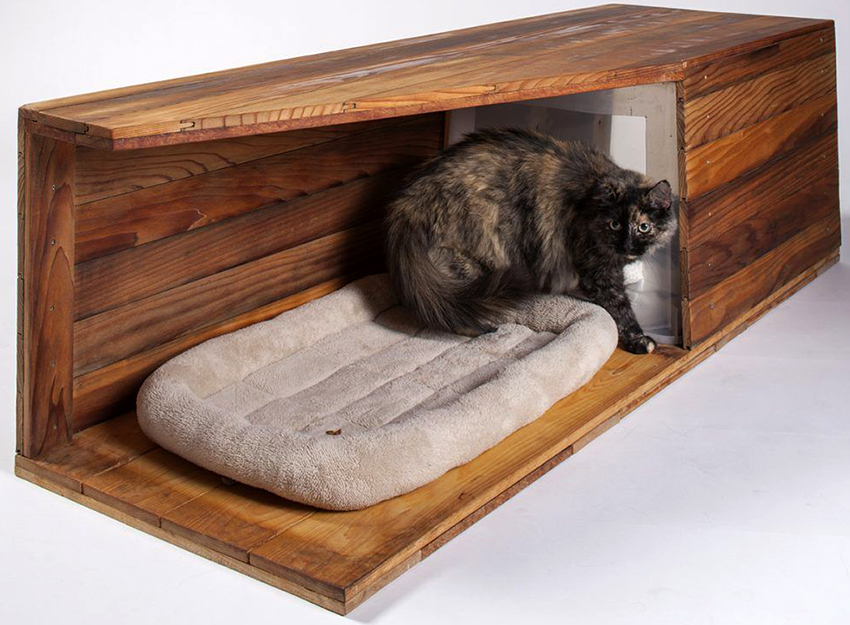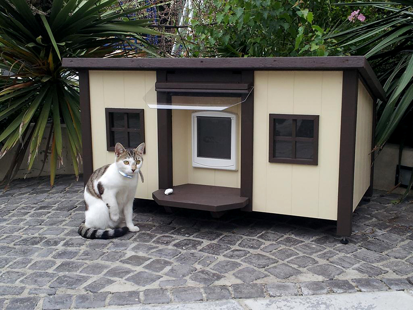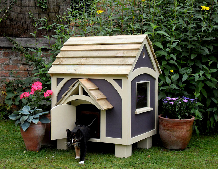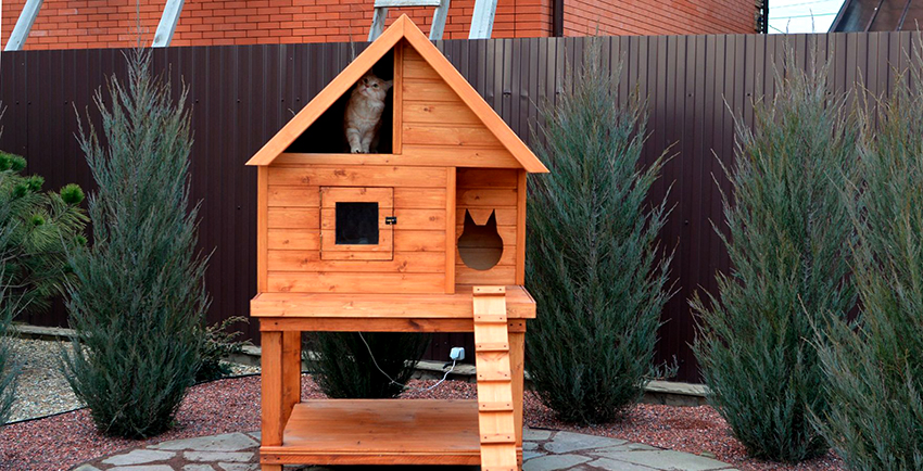 It is better to cover the outdoor cat house with a material that does not allow moisture and precipitation to pass through. If a dwelling is planned for another animal at the top, for convenience, the structure should be supplemented with a ladder. You can equip one side of the house with a scratching post, and put a soft bedding or mattress inside. In addition to the standard rectangular version, triangular houses are often made designed for installation in a corner space.