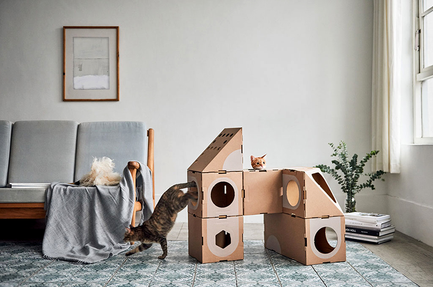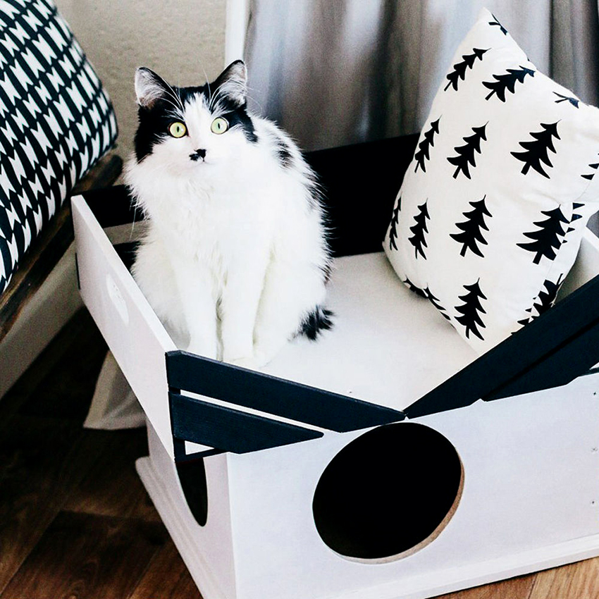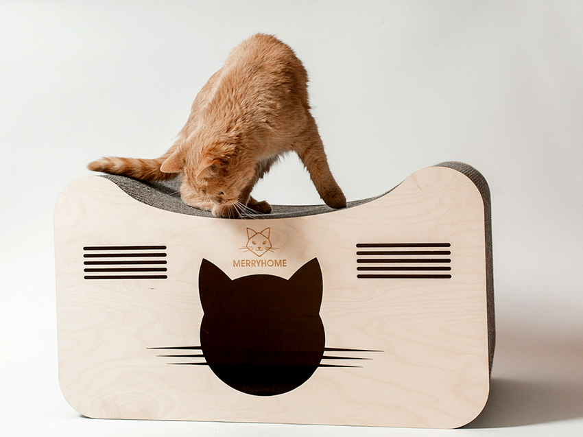 - As a playable element, you can attach a small springboard made of wood or textiles to the house. In this case, the cat will have an additional structure with which he can climb up.