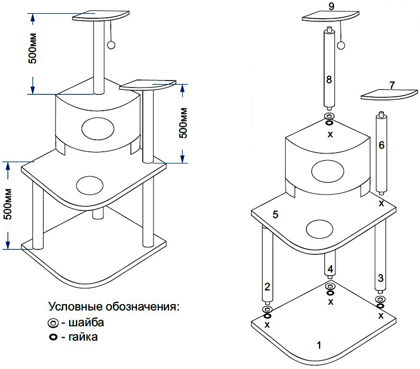 The best option for fasteners is PVA glue, which, after drying, does not emit any odors and is normally tolerated by cats. It is permissible to use glue to secure the rope and upholstery. Shelves and other elements of the house are nailed with ordinary nails.