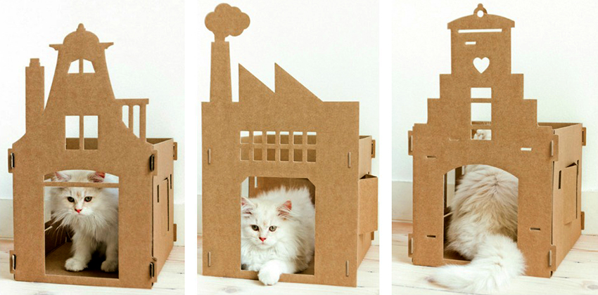 Do-it-yourself cat houses made of cardboard look very interesting and beautiful. This does not require the purchase of expensive materials or fastening systems. Due to the pliability of the material, it is easy to give the structure the desired appearance, but most often, preference is given to such forms as:
