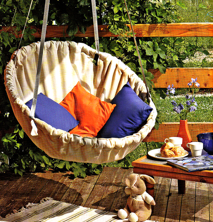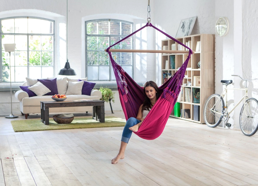 - Mukavuus ja laadukas lepo. On miellyttävää olla riipputuolissa missä tahansa iässä. Se ei ole yhtä mukava kuin lepotilassa, mutta tällaiset huonekalut vievät paljon vähemmän tilaa kuin pehmeät vastineet.