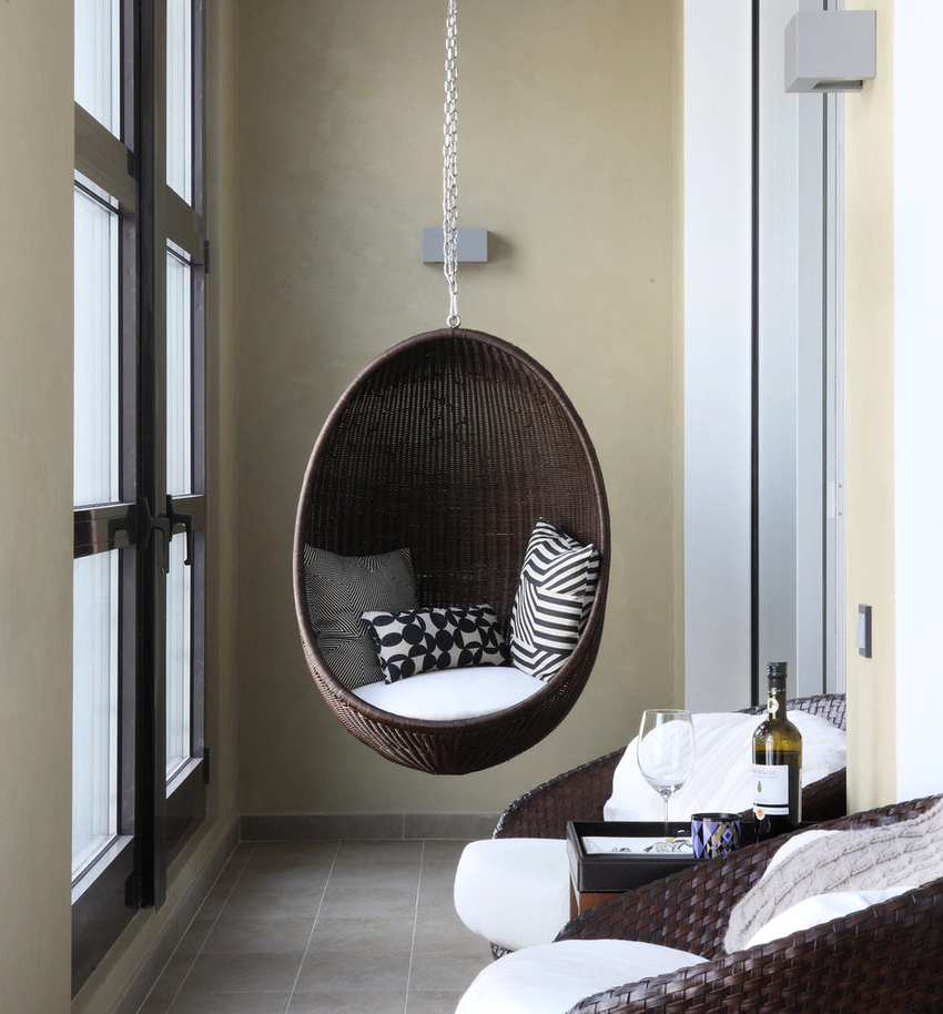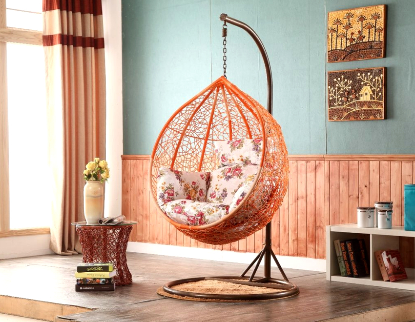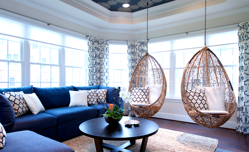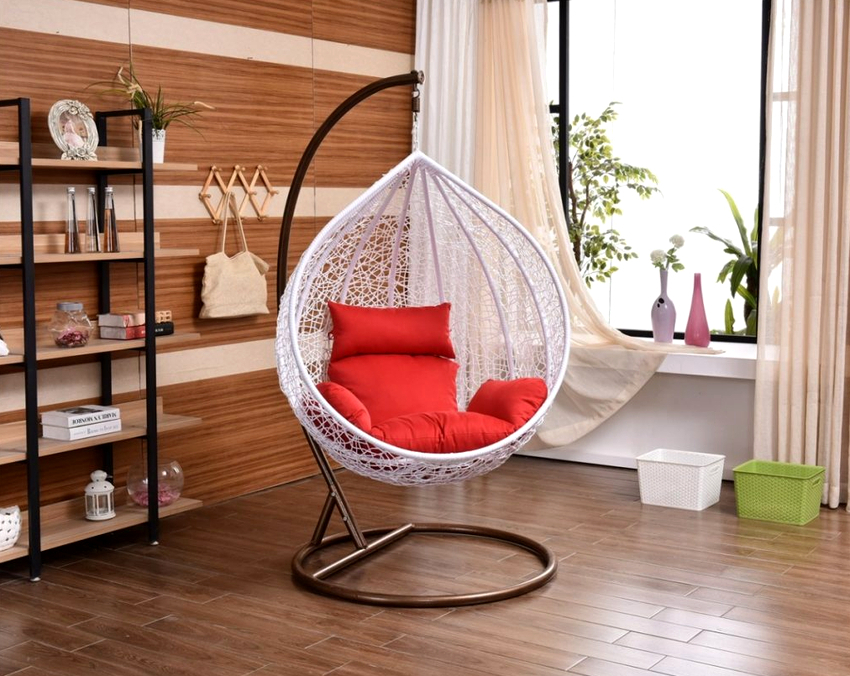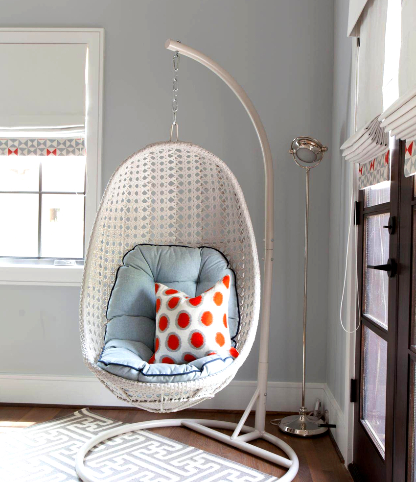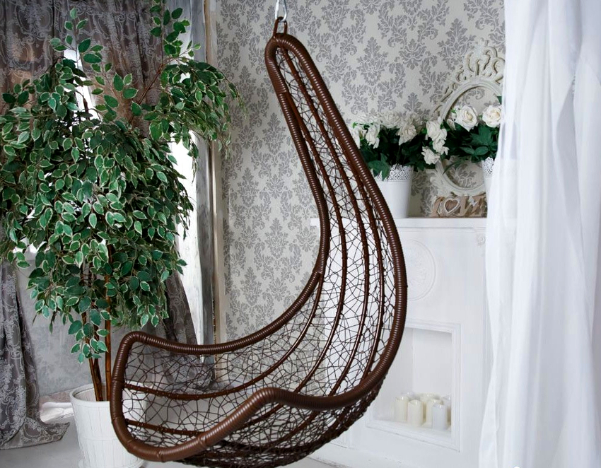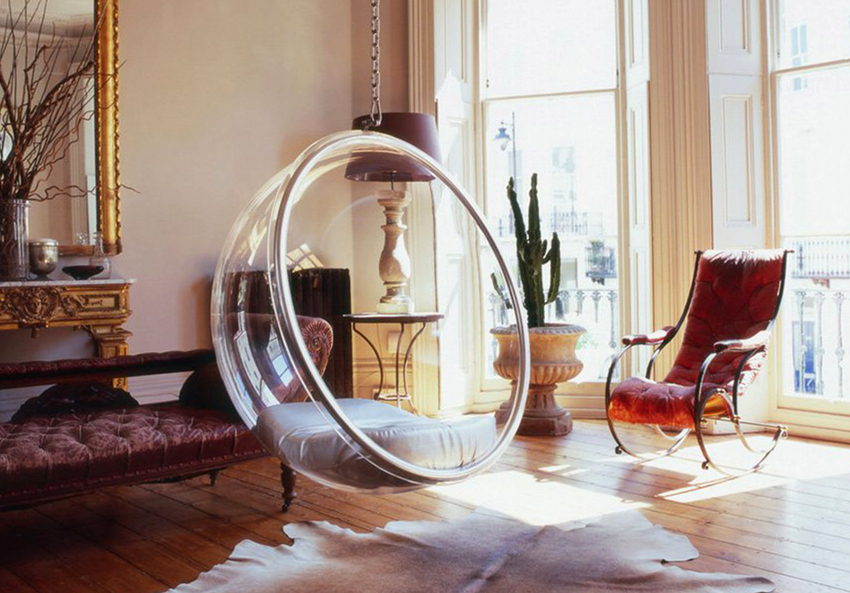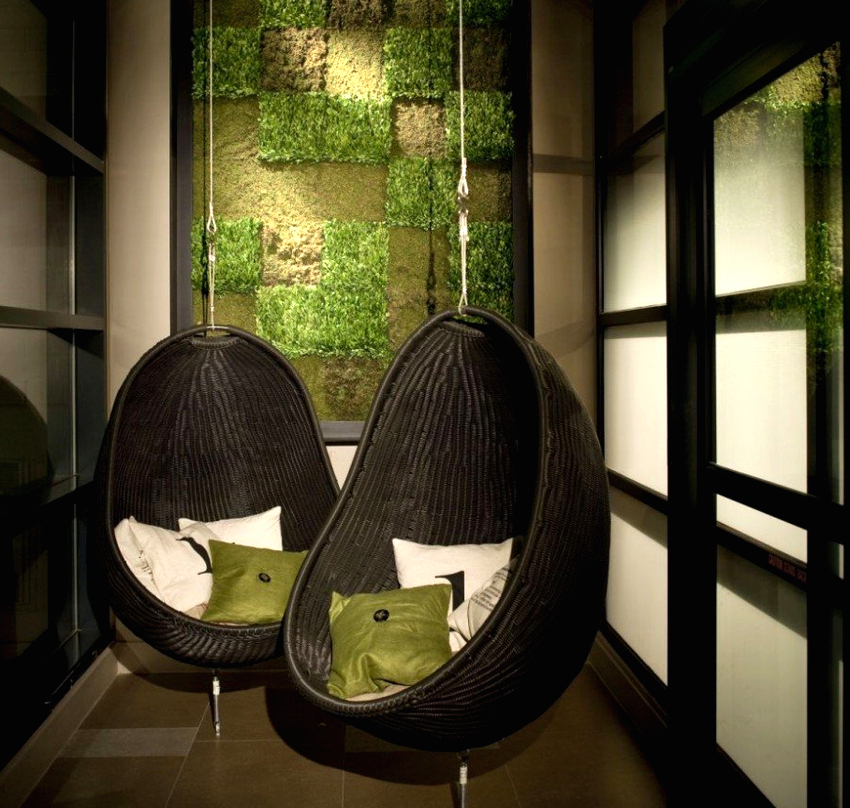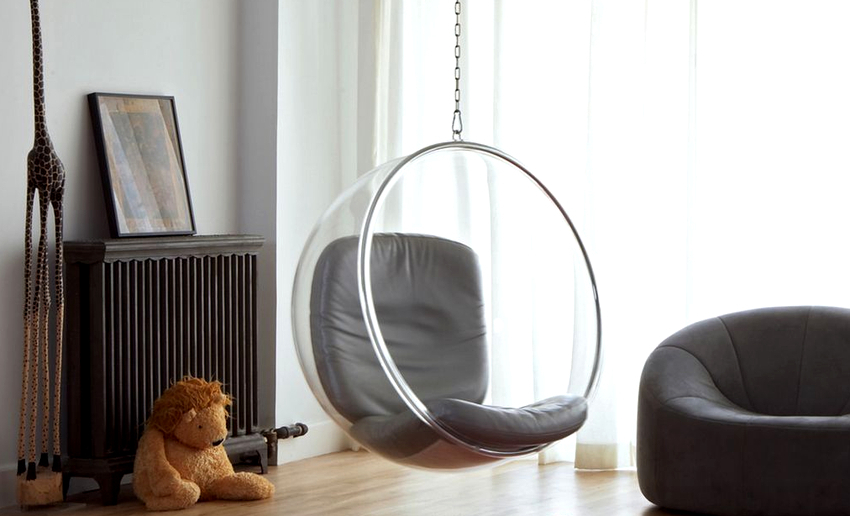 Sisätilojen ripustettavat tuolit näyttävät paljon näyttävämmiltä ja luovat painottomuuden tunteen avaruudessa. Katosta putoava ketju tai pitkä ohut kaapeli, jolla on pätevä lähestymistapa, voidaan tehdä kiinteäksi osaksi huonetta, ja sen päätehtävän lisäksi se on koriste-esine.