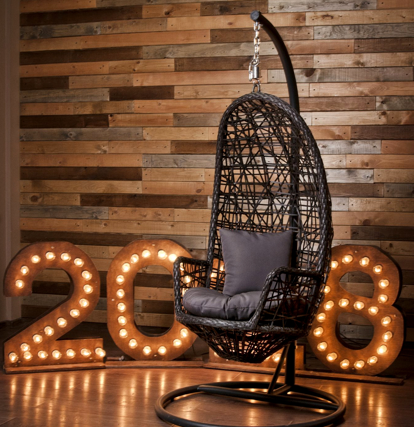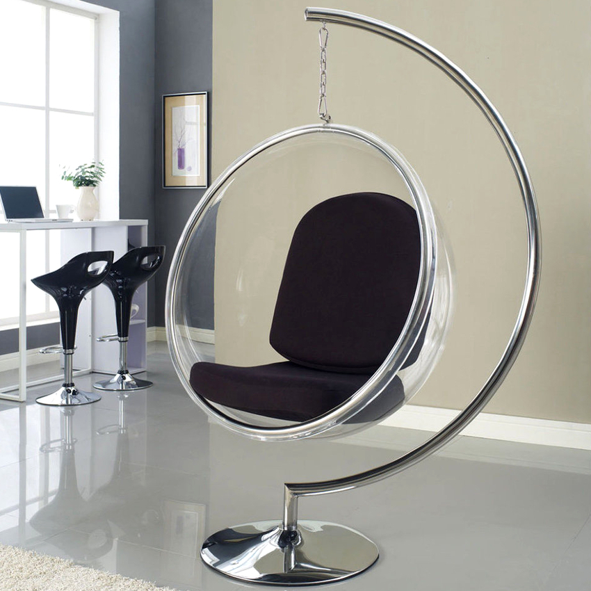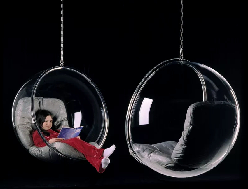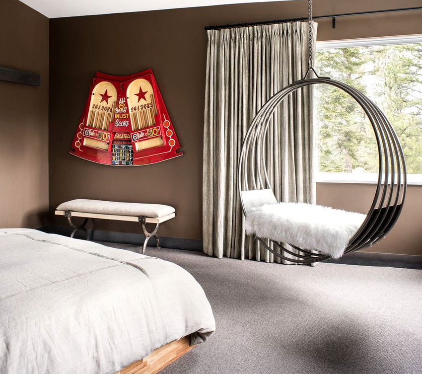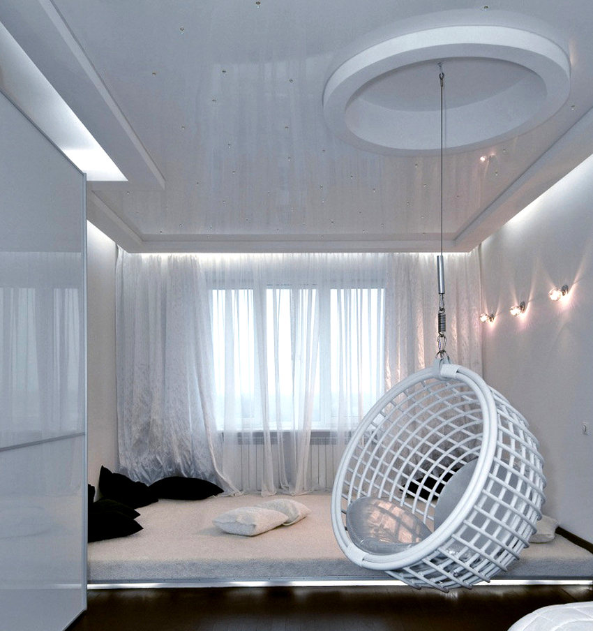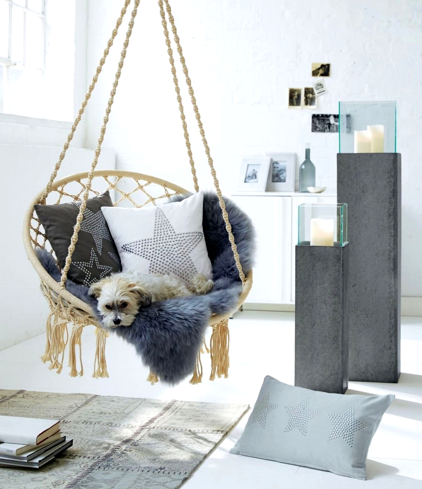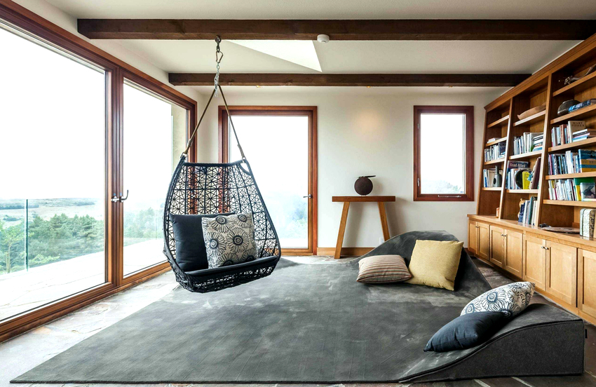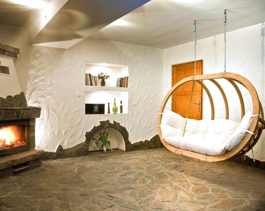 Sisätilojen ripustettavat tuolit näyttävät paljon näyttävämmiltä ja luovat painottomuuden tunteen avaruudessa. Katosta putoava ketju tai pitkä ohut kaapeli, jolla on pätevä lähestymistapa, voidaan tehdä kiinteäksi osaksi huonetta, ja sen päätehtävän lisäksi se on koriste-esine.