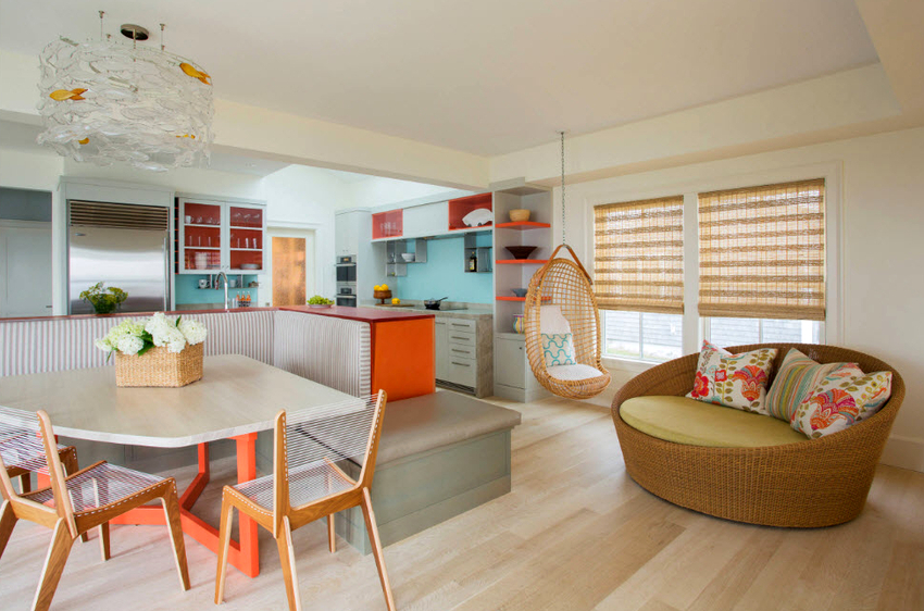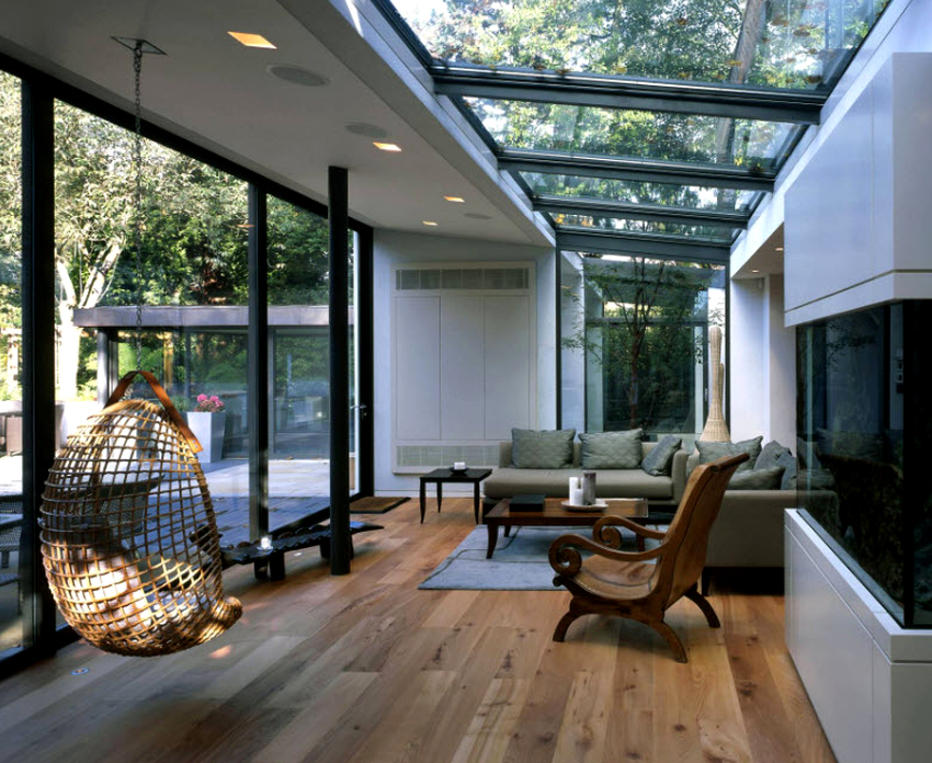 - Kuisti. Useimmiten täältä löytyy riippuvia tuotteita, koska ei ole mitään miellyttävämpää kuin rentoutua ja heiluttaa tuolissa raikkaassa ilmassa sisätiloissa, josta on näkymä puutarhaan, jossa on eläviä kasveja ja kukkia. Lankkulattian rottinkiset tuolit ovat hieno lisä mihin tahansa kotiin.