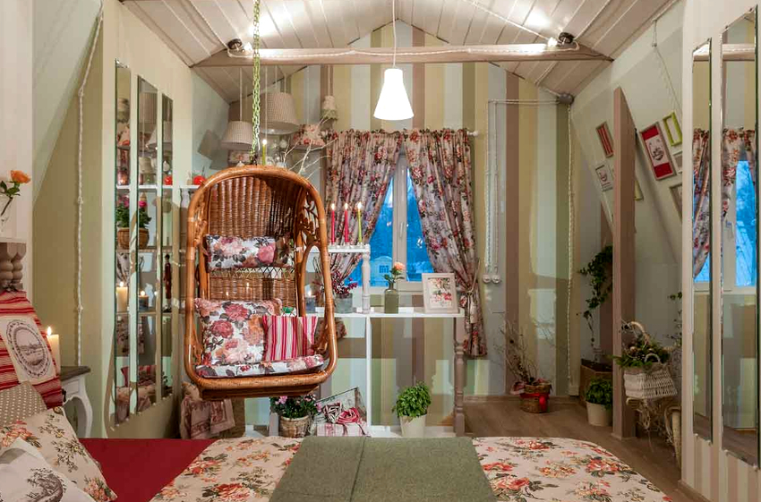 - Makuuhuone. On parempi sijoittaa tuote lähemmäksi ikkunaa mukavan lepopaikan järjestämiseksi. Makuuhuoneen tuolin tulisi sopia ihanteellisesti tekstiilien väreihin.