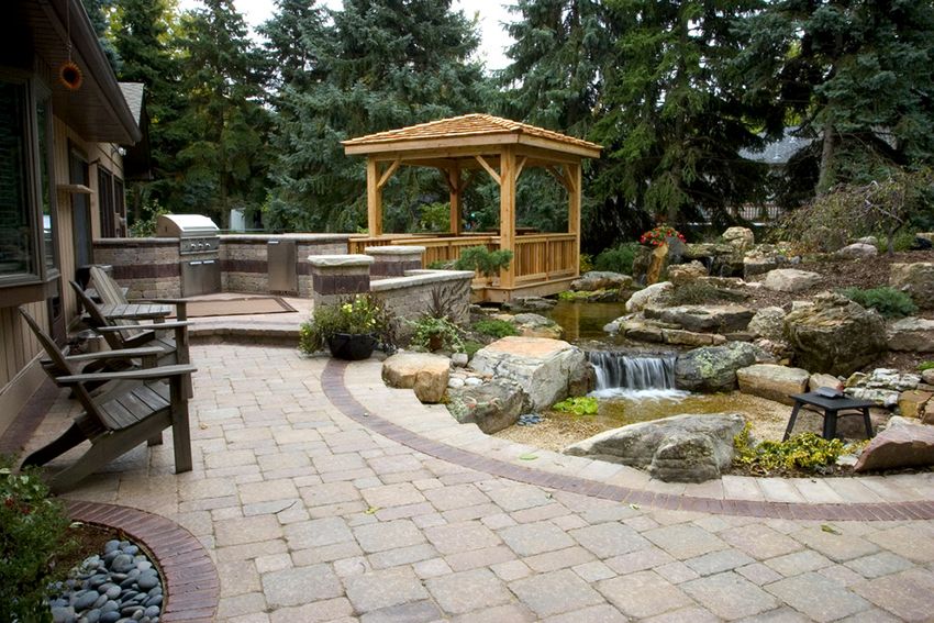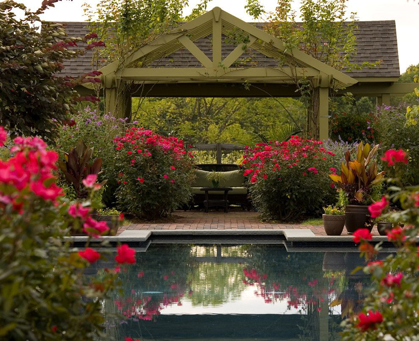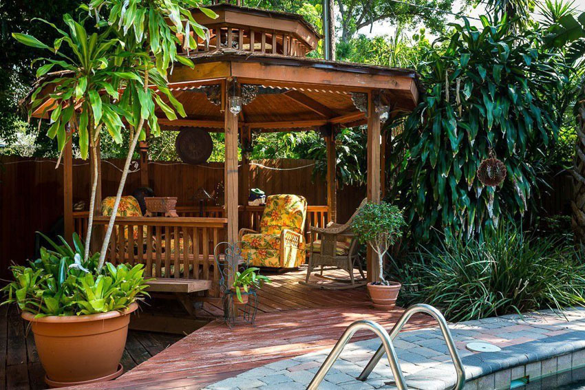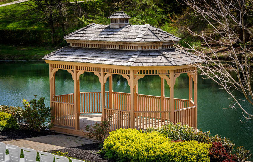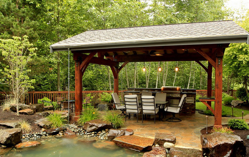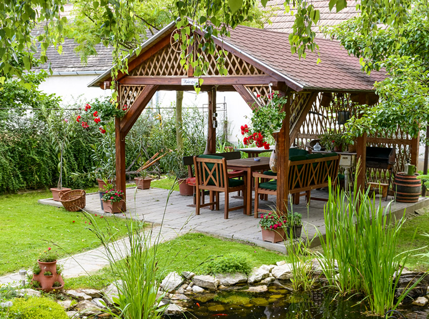 Yritä sijoittaa huvimaja puutarhaan, jossa puiden kruunut luovat paksun varjon. Huvimaja sijainti säiliön vieressä olisi loistava valinta. Onko se keinotekoinen uima-allas tai luonnollinen tippuminen ei ole niin tärkeää, tärkeintä on kylmyys ja tuoreus, joka tulee vedestä.