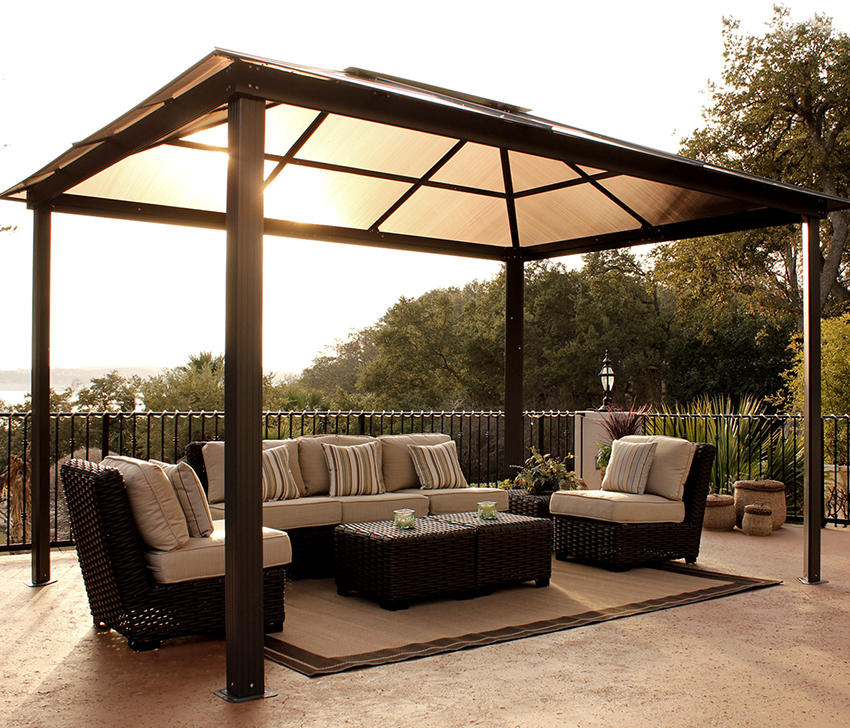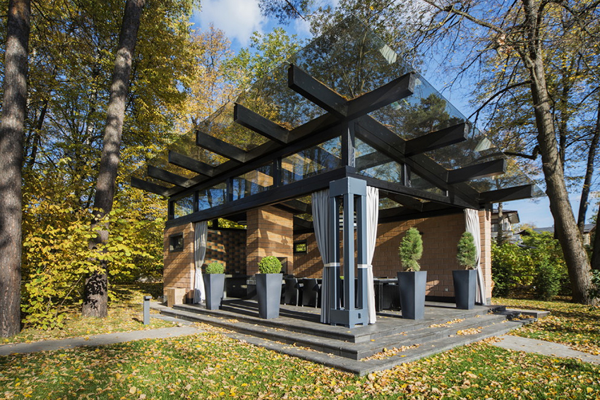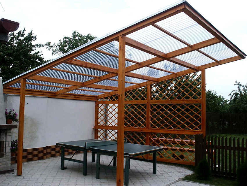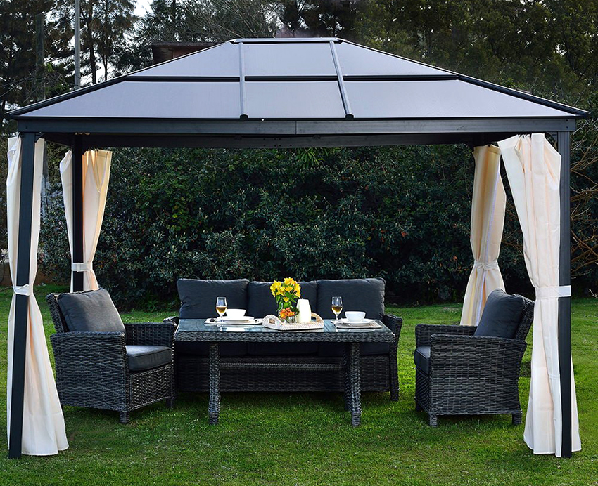 Niille, jotka haluavat suljettuja malleja, tarjotaan erilaisia vaihtoehtoja huvimajoille, joissa väliseiniin käytetään läpinäkyviä polykarbonaattilevyjä. Tällaisessa huvimajassa voit piiloutua tuulelta ja sateelta, ja valitsemalla kanneksi keltaisen tai oranssin, voit luoda illuusion auringonvalosta huoneen sisällä säästä huolimatta.