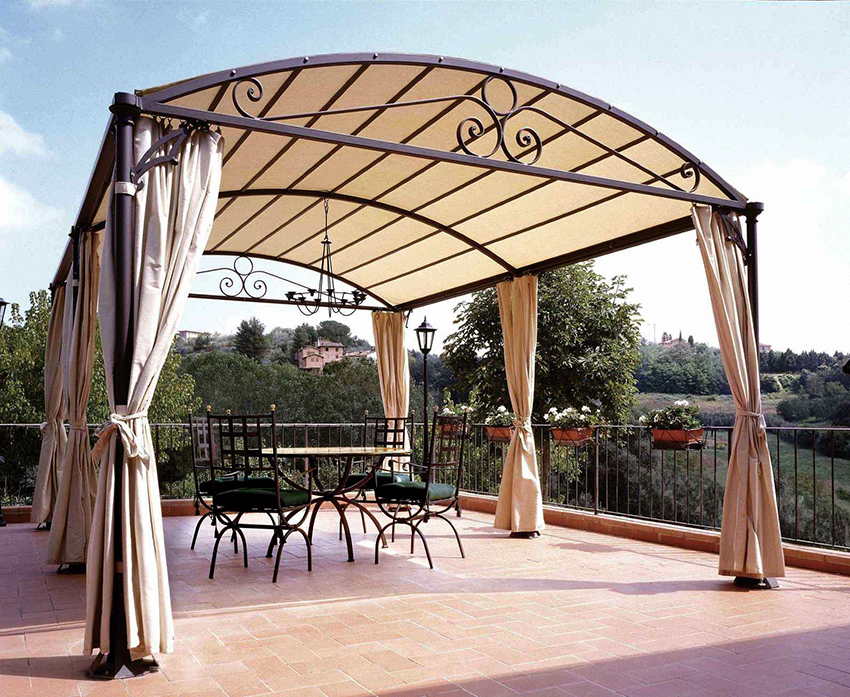 Tekstiilit auttavat antamaan yksinkertaiselle huvimajalle kodikkaan ilmapiirin. Kiinteä tai kukkainen verhot kussakin osassa aidat lisäävät paviljonkiin erityisen sielun. Kun käytät tekstiilejä sisustuksessa, ota huomioon alueesi vallitseva tuulen suunta. Voit ripustaa riippumaton huvimajaan tai riippuva tuoli... Jos valitsemassasi suunnittelussa on taottuja inserttejä, yritä sijoittaa samaan materiaalista valmistetut kaidetyyppiset silta välittömään läheisyyteen.