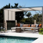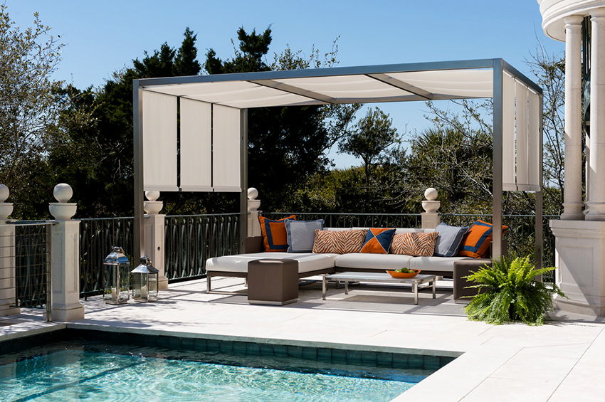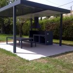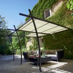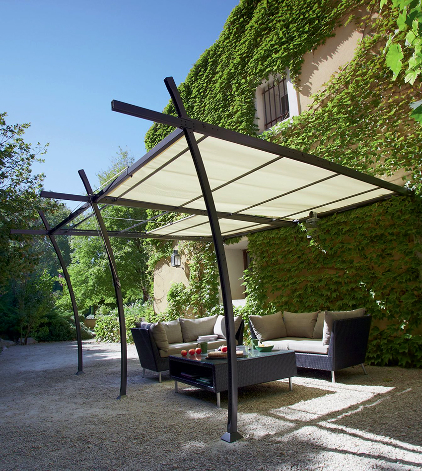 Yksinkertainen huvimaja-pergola metalliprofiilista ja markiisista