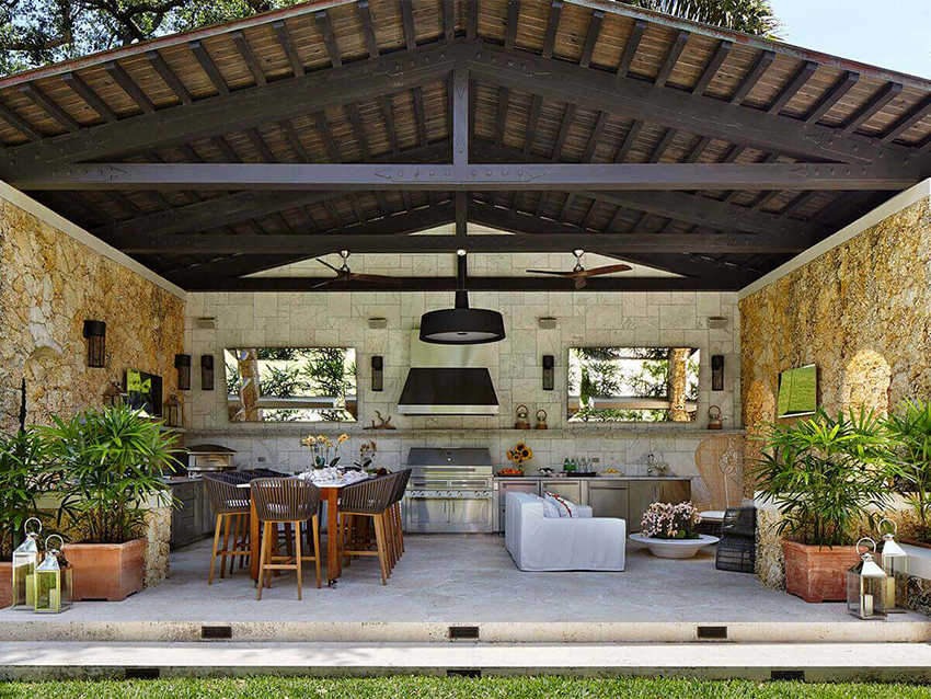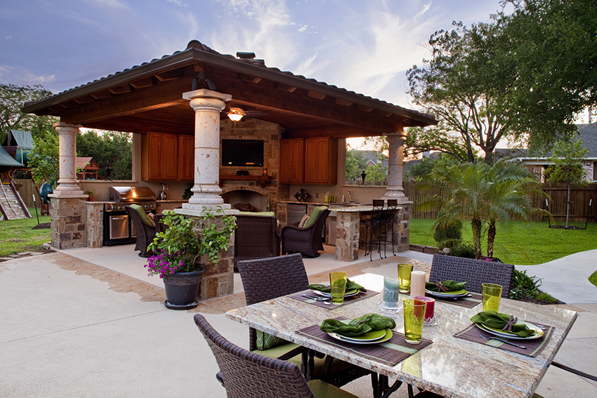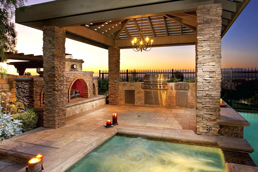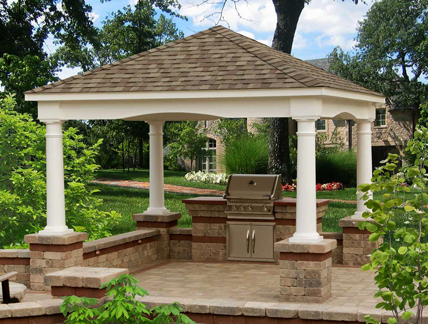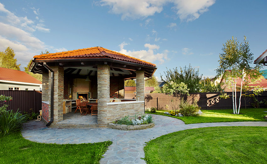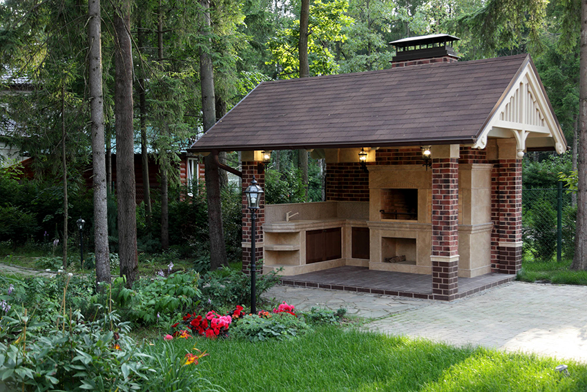 Kiinteät tiilirakennukset, joissa on suuret panoraamaikkunat ja kiinteät ovet, soveltuvat ympärivuotiseen käyttöön. Tiilen huvimajat varustettu grillillä, B-B-Q, savustamot ja takat. Se on sellainen rakennus, jota voidaan käyttää kesäkeittiönä ja joskus vierastalona.