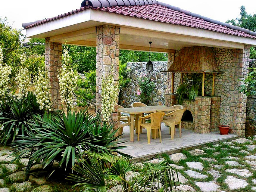 Tiili-huvimajat rakennetaan maahan, avoimina tai suljettuina. Yksinkertainen rakenne koostuu neljästä tukipylväästä ja katos heidän yläpuolellaan. Tällaiset rakenteet on helppo asentaa, mutta ne soveltuvat vain niille, jotka viettävät aikaa dachassa vain lämpimänä aikana.