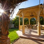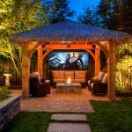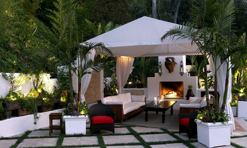 Upea näkymä paviljoniin antaa illan valaistuksella LED-nauhalla. Puutarha- tai sähkövaloilla voit valaista rakenteen kehän varovasti. Jos pidät romanttisen kokouksen, voit koristella yhden seinistä tavallisista lasiastioista valmistetuilla kynttilänjaloilla. Käytä inspiraatiokuviin huvimajoista yksityisen talon sisäpihalla, jossa on kauniita sisustuselementtejä.
