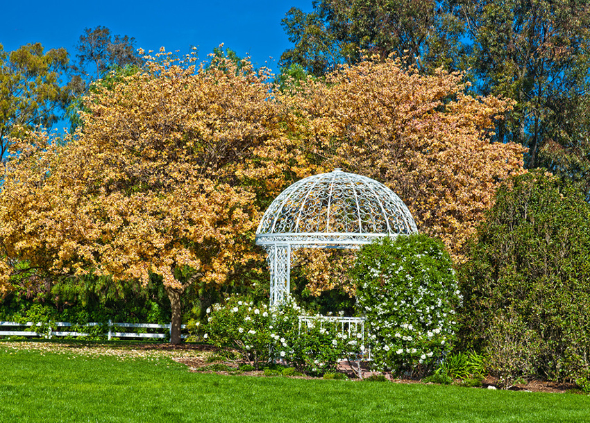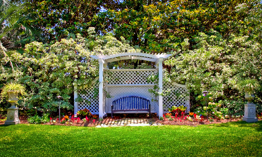 Voit lisätä ilmavuutta puiseen huvimajaan maalaamalla se vaaleilla väreillä: valkoinen tuo ripauksen puhtautta ja läpinäkyvyyttä, vaaleanpunainen lisää lämpöä ja hellyyttä, ja sininen tekee rakenteesta visuaalisesti painottoman.