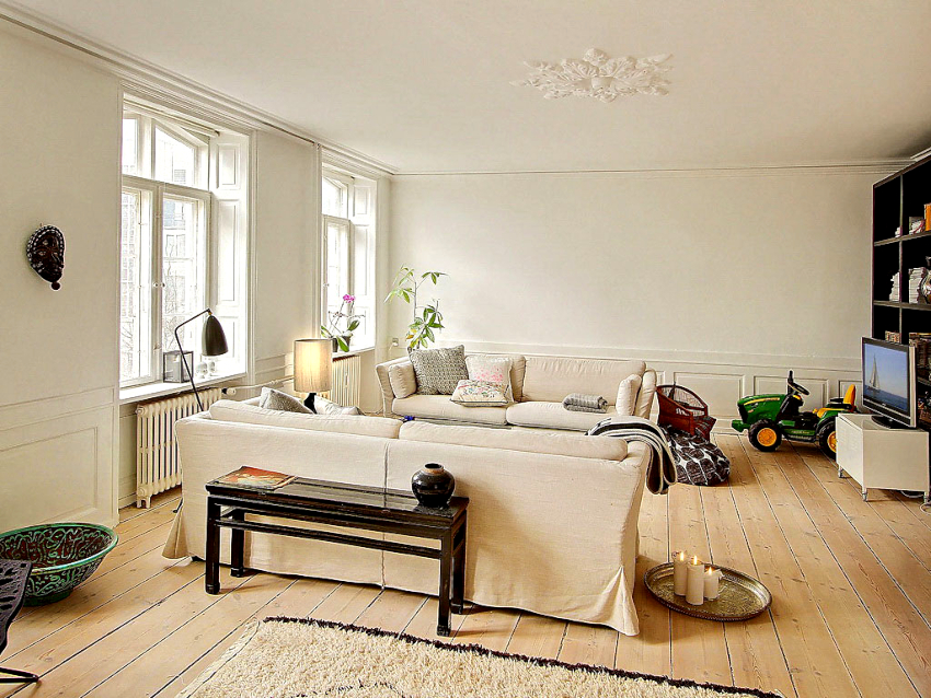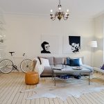 La pièce est finie exclusivement avec des matériaux naturels tels que le bois, la pierre, la fourrure. Vous pouvez utiliser des imitations de haute qualité, qui sont clairement affichées par les photos de la rénovation dans le salon. L'intérieur scandinave se caractérise par une palette de tons pastel clair, dans laquelle la place principale est donnée à la couleur blanche vierge. Les couleurs vives sont appropriées comme éléments d'accentuation.