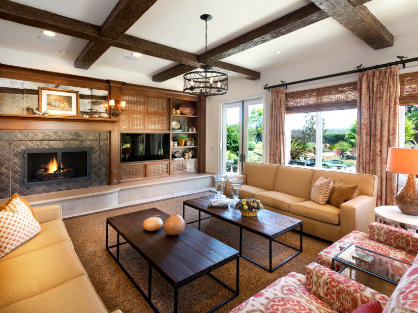 Une petite cheminée donnera une sensation unique de confort et de convivialité dans la chambre du salon. Pour un passe-temps agréable autour d'une tasse de thé et de votre livre préféré, vous pouvez installer quelques fauteuils et une table à roulettes à proximité, comme le montre la photo de l'intérieur du salon dans une maison privée avec cheminée.