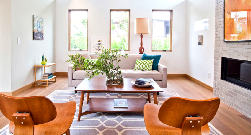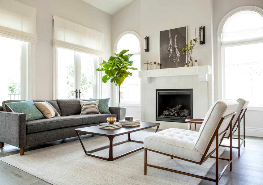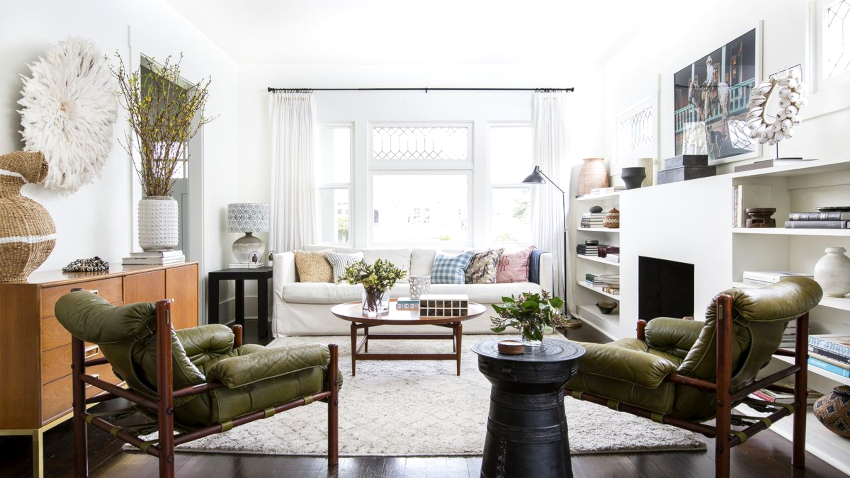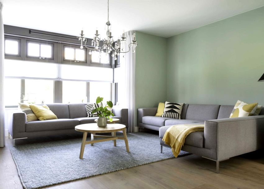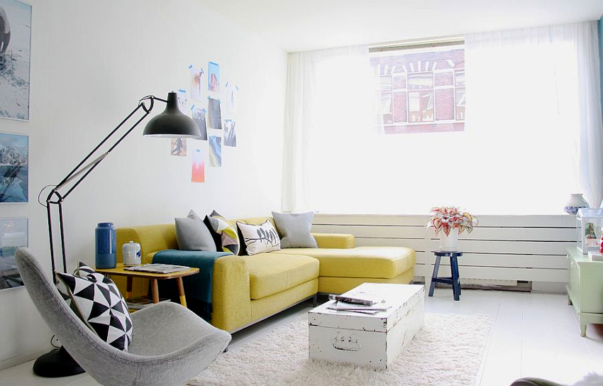 Un contraste saisissant crée du blanc combiné à des teintes naturelles telles que les jaunes ensoleillés et le bleu ciel. Le vert a l'air frais et naturel à l'intérieur du salon. Ces tons peuvent être utilisés pour les sols, les murs ou les meubles. Des accents simples peuvent être créés en utilisant des nuances de bleu cobalt ou de rouge cerise.