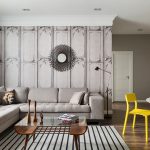 Vous pouvez ajouter de la chaleur à un intérieur minimaliste à l'aide de papiers peints monochromes légers avec une belle texture prononcée. L'un des murs peut être fini avec un matériau avec des motifs de couleurs plates ou des motifs floraux délicats. Une solution appropriée est un papier peint avec un motif qui correspond à l'atmosphère scandinave. Les options les plus populaires sont les conceptions graphiques, les images d'animaux ou leurs contours. Dans le salon avec cheminée, les peintures murales imitant le bois ou la pierre seront spectaculaires.
