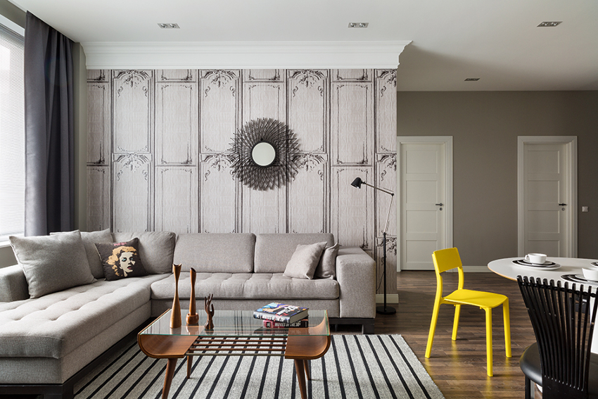 Le gris a l'air expressif et festif à l'intérieur du salon. En combinaison avec du blanc, il n'aura pas l'air terne. Vous pouvez raviver l'intérieur gris ennuyeux du salon à l'aide de couleurs lilas, cerise, prune, pistache ou olive, qui peuvent se refléter dans le rembourrage des meubles, les textiles ou la décoration.