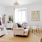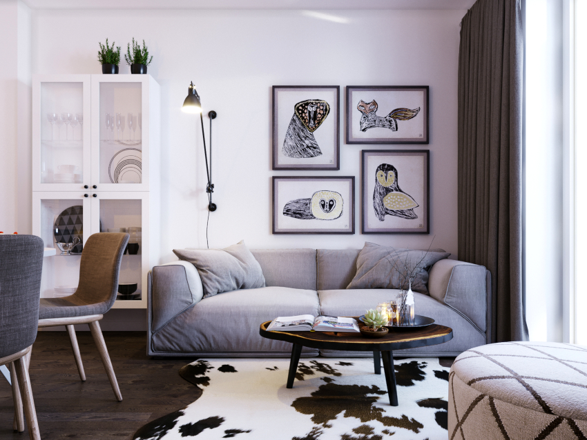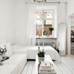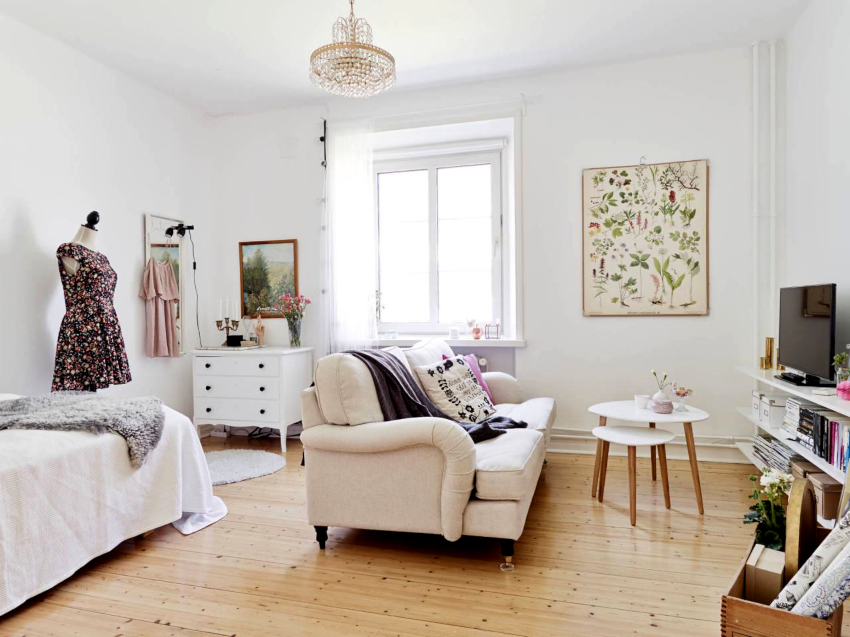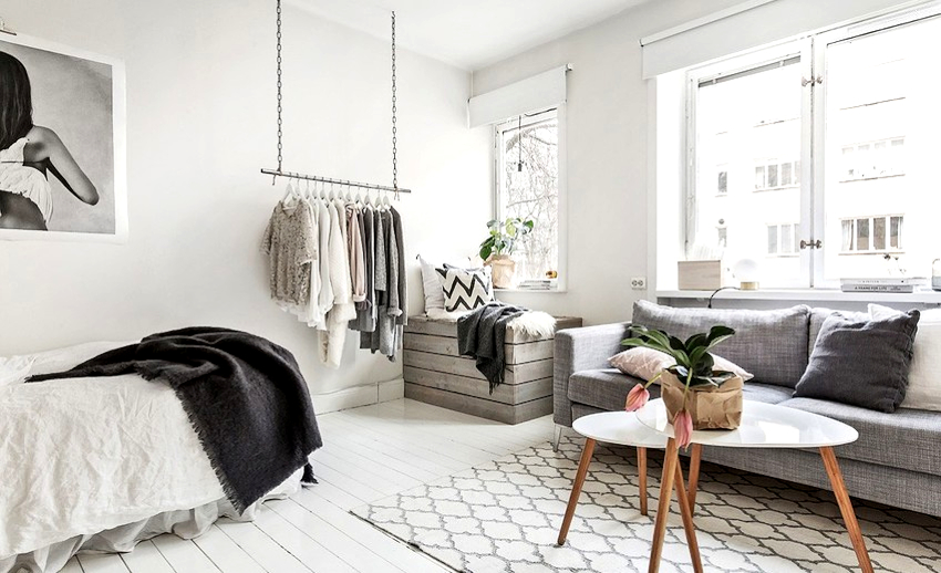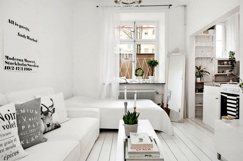 Le salon-chambre de style scandinave doit avoir un minimum de décoration. Il suffit d'accrocher une image sur l'un des murs, de placer des accessoires en porcelaine et en métal sur des étagères ouvertes, d'organiser des pots de fleurs avec des plantes d'intérieur et des vases avec des fleurs fraîches.