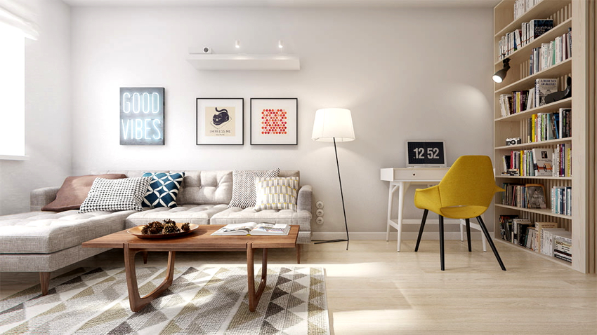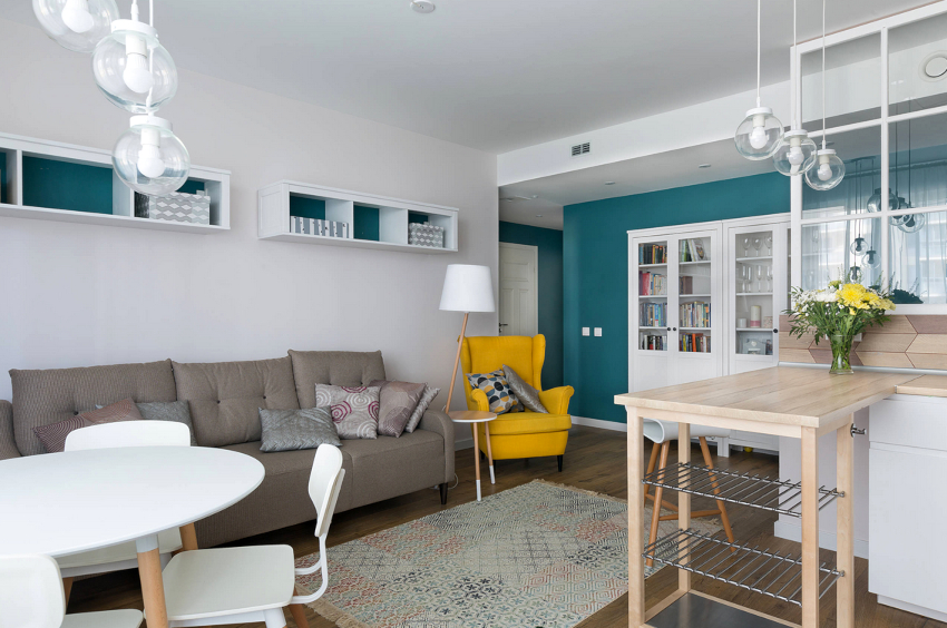La chambre-séjour partagée combine un coin salon, un espace de réception et un espace de rangement, en respectant la fonctionnalité de chaque espace séparé. La chambre-salon dans le style scandinave est décorée dans une palette claire. Les couleurs pêche et turquoise auront l'air originales et calmes à l'intérieur du salon-chambre. Des matériaux naturels sont utilisés dans la décoration. La pièce doit avoir un minimum de meubles et de décoration.