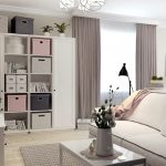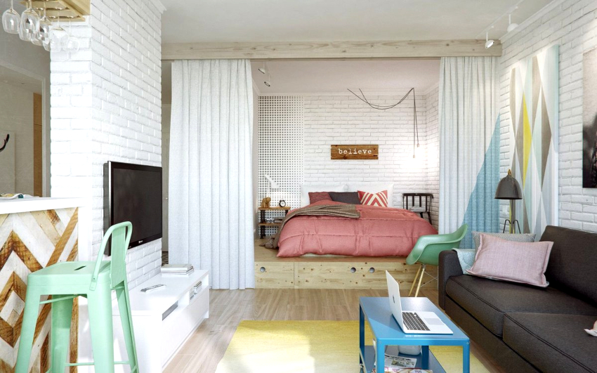 Pour dormir, vous pouvez installer un canapé pliant, qui se transforme en lit la nuit, et le jour est un lieu à part entière pour recevoir des invités. Une autre option consiste à créer un coin nuit séparé avec un lit et un espace invité avec un canapé, des fauteuils et une table basse.